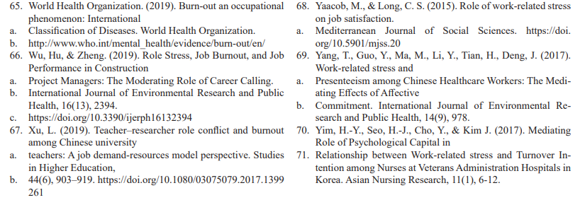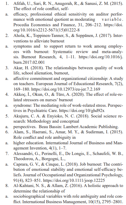 The relationship between role conflict and employee burnout is determined by many studies. Studies indicate that the low job per¬formance in employees/ employee burnout is due to role con¬flict they experience during performing their jobs (World Health Organization, 2019; explains that a negative relationship between role conflict and employee burnout. Pratiwi et al. (2019), found that role conflict is negatively correlated to the employee burnout. As Pratiwi et al. (2019), explain that the feeling of lack of control over a work situation and of the inability to enact a “rightful role” in the workplace may lead to job dissatisfaction in terms of posi¬tion held by the employee.