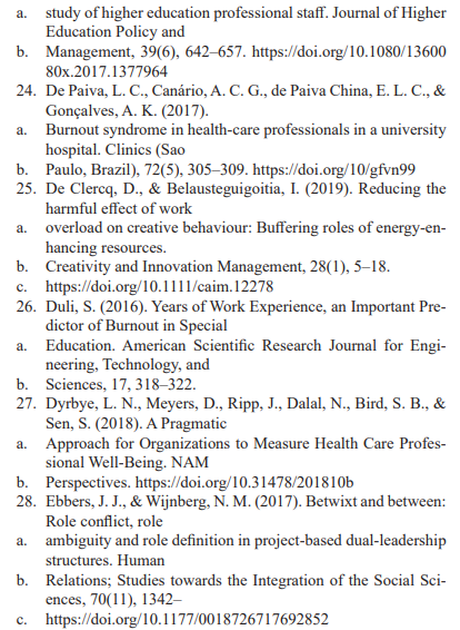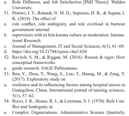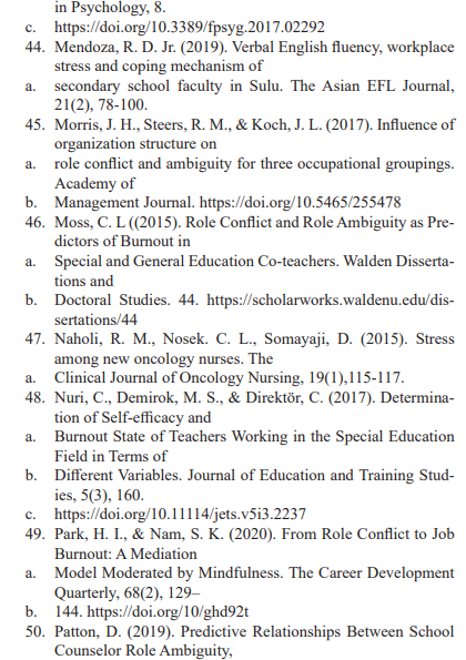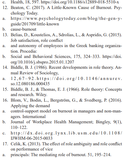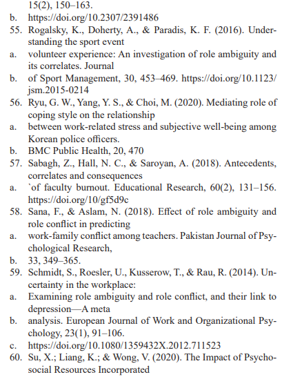 Occupational health literature reports evidence in support of the notion that role ambiguity, conflict, and overload are major causes of stress among workers (Schmidt et al., 2014; Ren et al., 2017). Park and Nam (2020), investigated how role ambiguity factors influences employee outcomes such as uncertainty about what is required to perform a role; role conflict, such as conflicting infor-mation about the same role; and role overload, such as too much work to complete. Role ambiguity was related to a reduction in psychological health, and lower commitment to the organization. In addition, role ambiguity was found to be related to burnout indicators, such as emotional exhaustion, depersonalization, low personal accomplishment, and less favorable levels of job-related attitudes, such as job satisfaction, organizational commitment, and turnover.