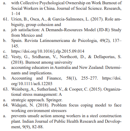 Burnout is consistently related to negative outcomes at individu¬al and 31organizational levels. These outcomes include anxiety, depression, disturbed mood, reduced job performance, and in¬creased absenteeism. Burnout can also have detrimental mental consequences. Beaton’s (2017)systematic review reveals that the psychological effects of burnout include insomnia, depression, use of psychotropic or antidepressant medications, and hospitalization for mental disorders. Burnout correlates with several affective consequences, as well. For example, an association exists between burnout and reduced job satisfaction, which can contribute to re¬duced organizational commitment, and increased turnover inten¬tions.