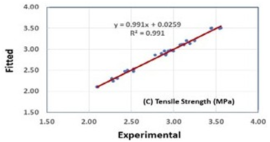 The statistical model, which was developed under varying mixture proportions to predict the tensile strength, has shown that all coefficients were significantly below the 95% confidence level and the tensile strength can be expressed by equation (4) with an R2 value of 0.99.