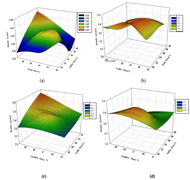 Figure 3: 3D Response surface plots for the effect of (a) sand and polymerized sulfur, (b) LFS and sand, (c) GGBFS and LFS, and (d)GGBFS and polymerized sulfur mass percentage on total density (Mg/m3)