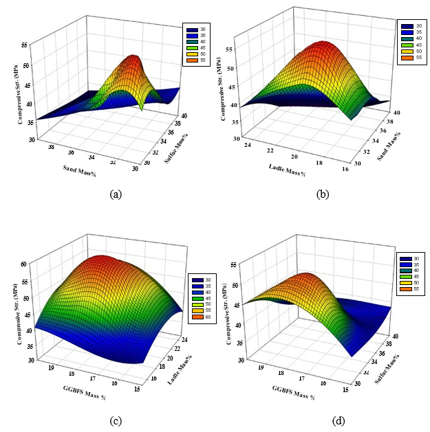 As shown in Figure 4, the interaction effects were found to be significant. Figure 4(a) indicates that the maximum compressive strength for the PSCM can be obtained at a polymerized sulfur mass content of 32-34% and dune sand content of 30-32%. As mentioned before, the studied response was obtained at constant GGBFS and LFS of 17% and 19%, respectively.