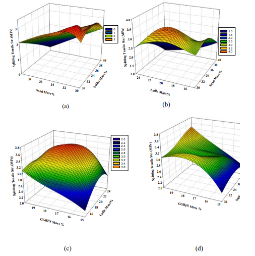Figure 5: 3D Response surface plots for the effect of (a) dune sand and polymerized sulfur, (b) LFS and dune sand, (c) GGBFS and LFS,and (d) GGBFS and polymerized sulfur mass percentage on the splitting tensile strength (MPa).