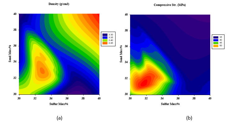 To have a better view of the input parameter values that need to be adopted and the ones that should be avoided to ensure maximum responses, 2D contour plots were generated to help in visualizing such zones (red zones of high responses and dark blue zones of minimum responses). As shown in Figure 6(a), the maximum density is reached at high polymerized sulfur and dune sand contents as expected, however, still relatively high density could be approached at the polymerized sulfur and dune sand mass percentage of 32-34%. On the other hand, maximum compressive and splitting strengths can be obtained at polymerized sulfur content of 30-34% and dune sand content of 30-34% as illustrated in Figures 6(b) and 6(c), respectively.