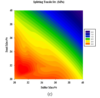 Figure 6: 2D Response surface plots for the effect of dune sand and polymerized sulfur mass % on (a) Density (Mg/m3), (b) Compressive strength (MPa), and (c) Splitting tensile strength (MPa).