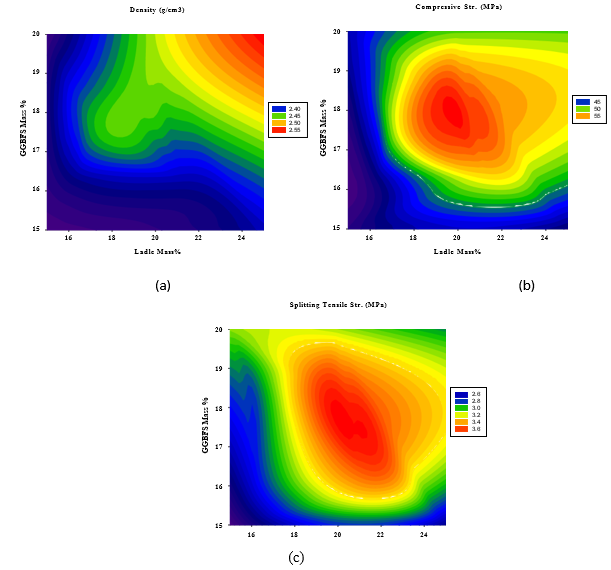 Figures 7(a-c) show that the maximum density is reached at high LFS and GGBFS content as expected. On the other hand,maximum compressive and splitting strengths can be obtained at LFS and GGBFS content of 22-24% and 18-19%, respectively.