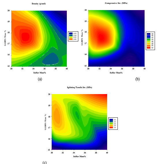 On the other hand, Figures 8(a-c) illustrate that the maximum density and compressive strength are reached moderate GBFS content of 17-19% and polymerized sulfur content of 32-34%, while the maximum splitting strength can be obtained at maximum GGBFS and polymerized sulfur content of 19-20% and 38-40%, respectively.