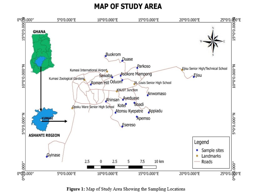 6.35° - 6.40′N latitude and 1.30° - 1.35′W longitude, covering an area of 254 km2. The aquifer in the area is a shallow type consisting of sand, with a thickness of approximately 7 – 10 m. The climate is classified as a wet sub-equatorial type, characterized by two peak periods of rainfall: in June and in September each year with an annual average high and low weather temperatures of 30.7°C and 21.5°C respectively. The average annual humidity is about 86% [29]. Kumasi is situated on a geologically diverse terrain characterized by an array of geological formations, including granite, metamorphic rocks, and sedimentary deposits. The region is known for its mineral-rich soils [30]. The fertile soil in Kumasi has been conducive for agricultural activities, playing a significant role in the local economy. The city holds a prominent position in terms of Ghana's economic, social, political, and cultural life. The population of the Kumasi Metropolis is approximately 2.5 million, including travelers from neighboring districts who engage in business activities. About half of the waste generated in Kumasi comes from households, while the remaining portion originates from industrial, institutional, and commercial sources [31].
