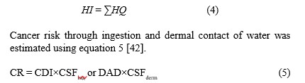 This study aimed to assess the health risk associated with household water used for drinking and other domestic purposes. The health risk evaluation utilized the United States Environmental Protection Agency (USEPA) risk assessment technique [35]. The assessment considered both ingestion and dermal contact as exposure routes for these metals in water. The chronic daily intake (CDI) and Dermal Absorbed Dose (DAD) all measured in mg/kg/day for the selected heavy metals were determined using equations 1 and 2 respectively [36,37].