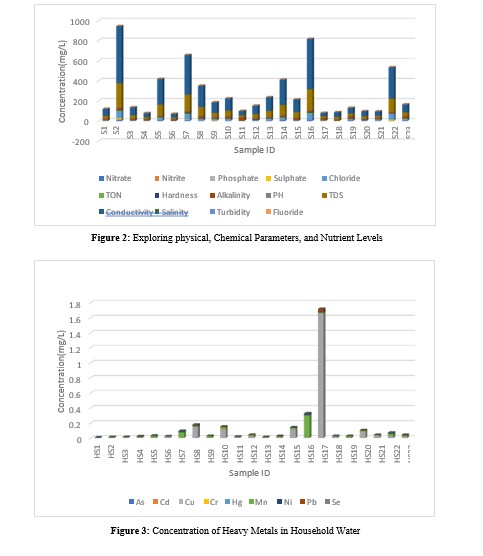 The research has uncovered a pressing need for public health concern within the Kumasi Metropolis, Ghana, in terms of household water quality. Significant findings with possible consequence on human health concerns were identified, notably the alarming presence of excessive levels of copper (Cu) and lead (Pb) alongside the widespread distribution of nitrite ions (NO2-) in specific water sources.