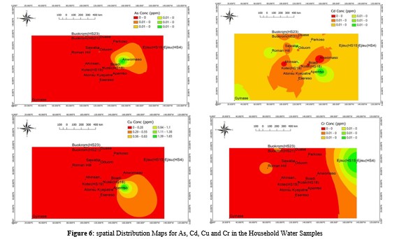 Household water sources can be vulnerable to heavy metal contamination due to natural weathering of rocks and some anthropogenic activities such as mining, industrial discharges, and improper waste disposal [20]. Pb is a toxic heavy metal that can contaminate household water sources through improper waste disposal and industrial activities as well as weathering of parent rocks [21]. Exposure to Pb in drinking water can result in neurological and developmental issues, especially in children. As, another toxic heavy metal, often enters water sources through natural geological processes or industrial activities [20]. Chronic exposure to contaminated water has been linked to various health problems, including skin lesions, cardiovascular diseases, and an increased risk of cancer [22]. Prolonged exposure to Cd through drinking water has been linked to kidney damage, skeletal disorders, and potential reproductive issues [23]. Hg, often released into the environment through industrial pollution or improper waste disposal, is a toxic heavy metal that accumulates in aquatic ecosystems and causes severe neurological problems and harms fetal development in pregnant women. Cr, especially in its hexavalent form, Cr (VI), is of concern due to its carcinogenic properties [24].