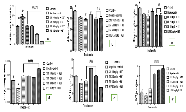 The effect of ethanolic extract of Schumanniophyton magnificum on ketamine-induced hyper-locomotion in mice based on the total distance travelled in open-field test (OFT) was shown in Figure 1a. The administration of ketamine (10 mg/kg, i.p.) significantly (P< 0.05) induced hyper locomotion compared with the group treated with vehicle (10mL/kg o.p), as shown by the increase in total distance travelled in the OFT compared with standard treatment. Schumanniophyton magnificum treatment across all groups show significant (P < 0.05) having decreased in the total distance travelled in the OFT compared with the standard treatment. Similarly, treatment with RIS (0.5 mg/kg, o.p) also significantly (P < 0.05) prevented the hyper-locomotion compared with the treated group [11].