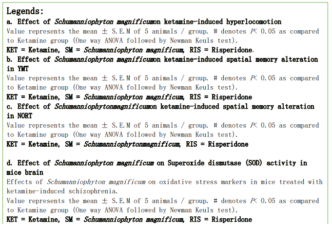 Psychosis is a debilitating condition that severely impacts individuals’ health and quality of life. Effective therapeutic strategies to prevent or manage psychosis are essential for global health, as mental illness manifests through behaviors such as impaired reasoning, depression, memory deficits, and social withdrawal [1,2]. However, there is limited knowledge about the potential of Schumanniophyton magnificum leaves in treating or preventing psychosis, as no studies have investigated its effects on this condition. This highlights the need for further exploration into the plant's therapeutic potential. Schumanniophyton magnificum has been reported to be effective in managing various ailments, including epilepsy, snake envenomation, viral infections, depression, and fertility issues [3]. Despite its traditional uses, there is a lack of research into its role in psychosis treatment, making this investigation particularly significant. The focus of this study is to evaluate the neurobehavioral effects of Schumanniophyton magnificum ethanolic extract in a mouse model of ketamine-induced psychosis, with the aim of contributing valuable insights into new therapeutic strategies. By investigating the plant’s potential, this research seeks to offer cost-effective solutions for addressing both the health and socioeconomic challenges associated with psychosis.