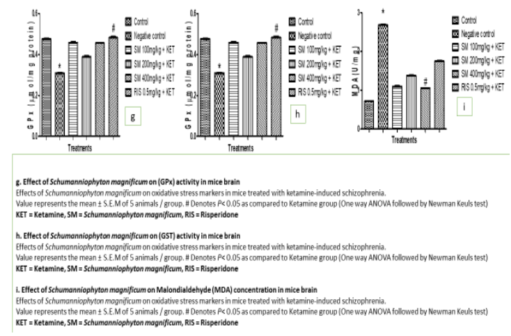 The effect of ketamine administered alone or in combination with Schumanniophyton magnificum on the activities of CAT in the brain of mice was shown in Figure 1 f. Administration of Schumanniophyton magnificum (100, 200, and 400 mg/kg, o.p.) with ketamine (10 mg/kg, i.p.) daily for 14 days significantly (P < 0.05) increased brain CAT activity compared with the ketamine-treated group. Also (atypical antipsychotic drug) Risperidone (0.5 mg/kg, o.p.) with ketamine (10 mg/kg, i.p.) daily for 14 days significantly (P < 0.05) increased brain CAT activity compared with the ketamine-treated group. 5.7 Effect of Schumanniophyton Magnificum on GPx Concen¬tration in Mice Brain The effect of ketamine administered alone or in combination with Schumanniophyton magnificum on the concentration of GPx in the brain of mice is shown in Figure 1g. Administration of Schumanniophyton magnificum (100, 200 and 400mg/kg, o.p.) with ketamine (10 mg/kg, i.p.) daily for 14 days has no significantly (P < 0.05) increased in brain GPx concentration compared with the ketamine-treated group. Treatment with standard drugs Risperidone (0.5 mg/kg, o.p.) with ketamine (10 mg/kg, i.p.) groups only show a significant (P < 0.05) increase in GPx concentration compared with the ketamine-treated group.