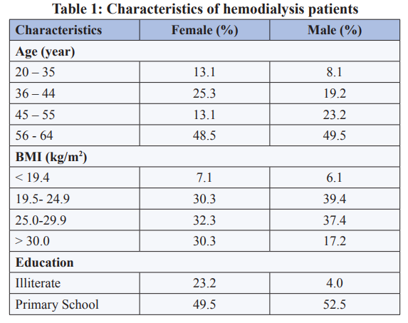 This study included 198 ESRD patients (99 females, 99 males) who were being treated with hemodialysis 3 times a week. The general characteristics of the study group are shown in Table 1.