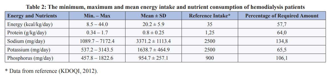 The average energy intake of patients was 20.2±5.9 kcal/kg/day, while the average protein intake was 0.8±0.25 g/kg/day (Table 2). The average sodium, potassium and phosphorus consumptions of the patients were 3371.2±1113.4, 1638.7±464.9 and 954.7±257.1, respectively.