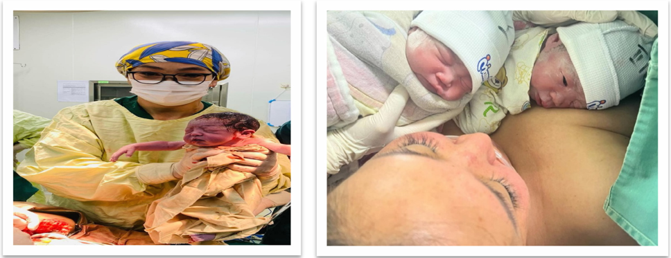 Placental Findings: The placentas were intact with a combined weight of 610 g and a thickness of 1.9 cm; the diameter measured 18 × 21 cm. The umbilical cord had a central insertion and was 50 cm in length. The estimated blood loss during surgery was 500 mL. Postoperatively, both the mother and neonates remained stable. The patient was monitored in the postpartum ward for 72 hours and was subsequently discharged in good condition.