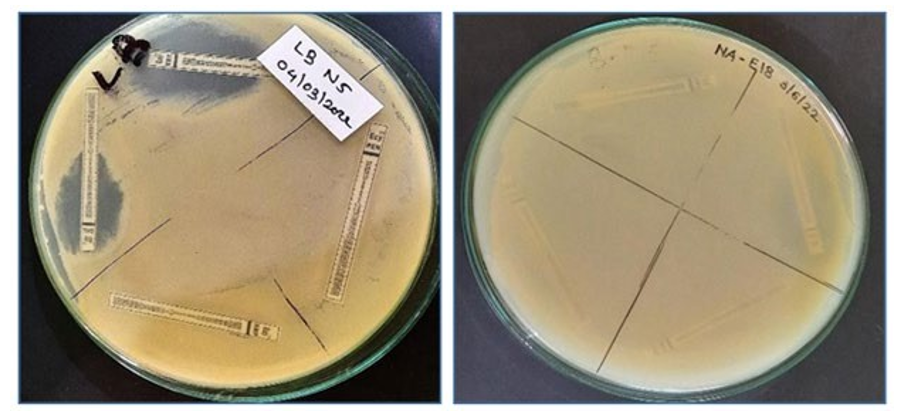 Isolates, which are showing efficient results, are subjected for an¬tibiotic assay. All isolates were grown in NB and KB broth respec¬tively for 48 hrs. After incubation freshly grown 500µl sample was evenly spread on NA and KB agar and antibiotic strips with lower to higher concentration range were placed on plate aseptically and incubated it for 48hrs. After incubation, plates were observed Fig¬ure 4 and results were recorded.