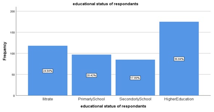 A total of 490 study participants were approved during this study, and data gathered from 475 respondents via face-to-face interviews with a structured questionnaire. Out of fifteen who were not interviewed, all are refusal to participate. The response rate for this study was 96.9% which keeps with the study’s assumption of a10% non-response rate. Two hundred thirty-two (48.8%) of the respondents are males while 243(51.2%) are females. Regarding the age of respondents 170(35.8%), 119(25.1%) 115(24.2%) 42(8.8%) and 29(6.1%) were aged between 18-27years, 28-37years, 38-47years, 48-57years and 58 and above years respectively. The mean age (±SD) of study participants were 35.24(±12.937). Majority of the respondents 249(52.4%) were married. Concerning respondents’ ethnic group 447(94.1%) were Amhara, 15(3.2%) were Oromo, 4(0.8%) were Tigre, 3(0.6%) were gurage and the rest 6(1.3%) were others. Of the respondents of the study 409(86.1%) were Orthodox, 39(8.2%) were Muslims, 25(5.32%) were protestants and 2(0.4%) of them were others. Large number of respondents 175(36.8%) have attended higher education, while 85(17.9%) were attended secondary school, 97(20.4%) were attended primary school and 118(24.8%) were illiterates. Of the study participants 88(18.5%) were unemployed, 51(10.7%) were self-employed and 138(29.1%) earned less than or equal to500 birr.