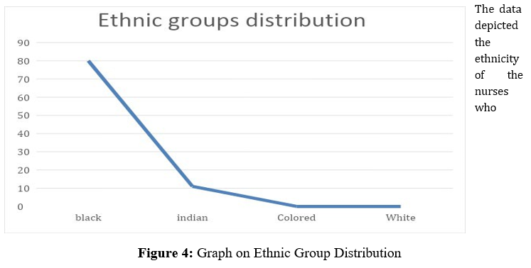 participated in this study. indicates that the study participants were predominantly black nurses, with only a small percentage of colored/white nurses. This is supported by the statistical data, which shows that only 4.5% of the participants identified as colored/white, while 80% identified as black. The line graph also corroborates this information, visually depicting the large proportion of black nurses compared to other ethnic groups. This finding is consistent with the reported demographics of nurses in South Africa. According to the South African Nursing Council, black nurses make up the majority of the nursing workforce, comprising approximately 85% of registered nurses. This is due to historical factors, such as apartheid and the lack of opportunities for colored/white nurses during that era. It is important to note that the study's findings are specific to the particular institution and may not necessarily reflect the demographics of nurses in other healthcare settings or regions of South Africa. However, the data does provide valuable insights into the ethnic composition of the nursing workforce in the context of the study.
