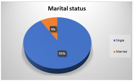 Figure 1 below shows the marital status of the participants. The majority of the study participants fall under the single category n= 232 (91%) and n=23 (9%) participants were married.