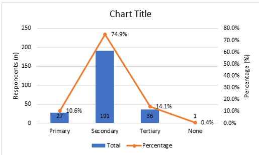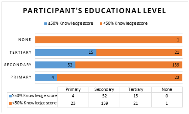 In this study the majority of the participants were educated, of which n= 191 (74.9%) of the participants had secondary education, those with tertiary education were n=36 (14.1%) and those who had primary education were n= 27 (10.6%). Only n= 1 (0.4%) did not had any educational background.