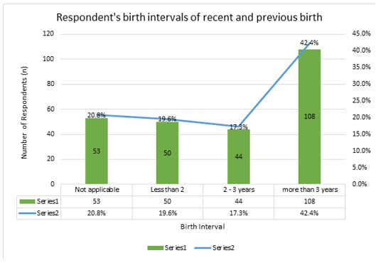 This study investigated the gap between the recent and the previous birth. The finding illustrated that most participants n= 108 (42.4%) had more than three years birth intervals. n= 53 (20.8%) of the participants were first time mothers. Those who gave birth in less than 2 years were n= 50 (19.6%), while those with the birth intervals of 2-3 years were n= 44 (17.3%).