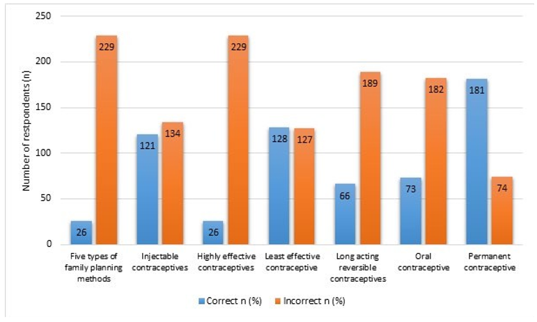 The result indicated that participants n=182 (71.4%) out of 255 were incorrect when asked to select the oral family planning method offered to postnatal breastfeeding women at IHK.