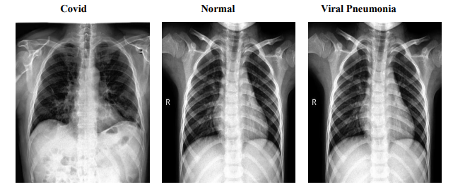 The COVID dataset is a crucial resource comprising 317 JPEG images, meticulously categorized into 'COVID', 'Normal', and 'Viral Pneumonia'. Organized into 'train' and 'test' branches, this dataset ensures streamlined access and efficient navigation, facilitating both model training and validation. Originating from Kaggle, this collection provides a foundational platform for developing sophisticated models aimed at distinguishing these respiratory conditions effectively. Figure 1 presents sample images from each category, illustrating the distinct visual features that help models differentiate between COVID-19, normal lung conditions, and viral pneumonia. These sample images reflect the dataset’s capacity to represent unique patterns across categories, aiding in model training. The 'train' branch includes 111 images classified as 'COVID', 70 as 'Normal', and 70 as 'Viral Pneumonia', providing a rich variety of data to enhance model learning capabilities through exposure to diverse patterns and features inherent in different conditions. Conversely, the 'test' branch is critical for evaluating model robustness and accuracy on previously unseen data, comprising 26 'COVID' images, 20 'Normal', and 20 'Viral Pneumonia'. This setup ensures that the models can be rigorously tested to assess their performance accurately.