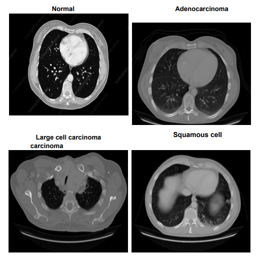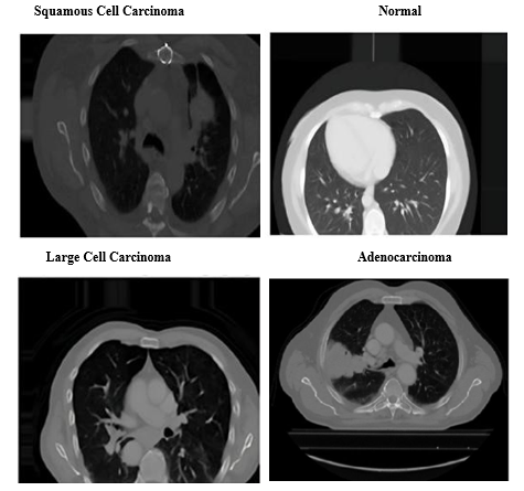 images serve as key visual references, supporting model training to accurately classify each type. The 'test' set comprises 315 images with 54 Normal, 120 Adenocarcinoma, 51 Large cell carcinoma, and 90 Squamous cell carcinomas. The 'train' set includes 613 images featuring 148 Normal, 195 Adenocarcinoma, 115 Large cell carcinoma, and 155 Squamous cell carcinomas, while the 'validation' set contains 72 images with 13 Normal, 23 Adenocarcinoma, 21 Large cell carcinoma, and 15 Squamous cell carcinomas. Adenocarcinoma, the most prevalent form of lung cancer, constitutes approximately 30% of lung cancer cases and 40% of non-small cell lung cancer (NSCLC) cases, typically manifesting in the outer regions of the lungs. Large cell carcinoma, known for its rapid growth, accounts for 10-15% of NSCLC cases and can appear anywhere in the lung. Squamous cell carcinoma, making up about 30% of NSCLC, is primarily found in the central regions of the lung and is often linked to smoking. This dataset’s detailed categorization and high-quality imaging make it an invaluable resource for developing diagnostic models that distinguish between different types of lung cancer, enhancing our understanding and management of this complex disease.