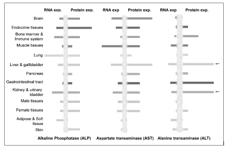 In humans, ALP is present in all tissues, but is particularly concentrated in the liver, bile duct, kidney, bone, intestinal mucosa, and placenta [7]. Quantitative tissue specific ALP and other liver function enzyme expression levels, particularly, alanine transaminase (ALT) and aspartate transaminase (AST), were presented in the Fig 1. In the serum, twotypes of ALP isozymes are present: skeletal and liver [7, 8]. during childhood, the majority of ALP are of skeletal origin. Humans and most other mammals contain the following ALP isozymes: ALPI– intestinal (molecular weight of 150 kDa), ALPL– tissue-nonspecific (expressed mainly in liver/bone/kidney), ALPP–placental (Regan isozyme), and GCAP – germ cell. Four genes separately encode the four isozymes [9-11]. The gene for tissue-nonspecific ALP is located on chromosome 1, and genes for the other three isoforms are located on chromosome 2 [12].