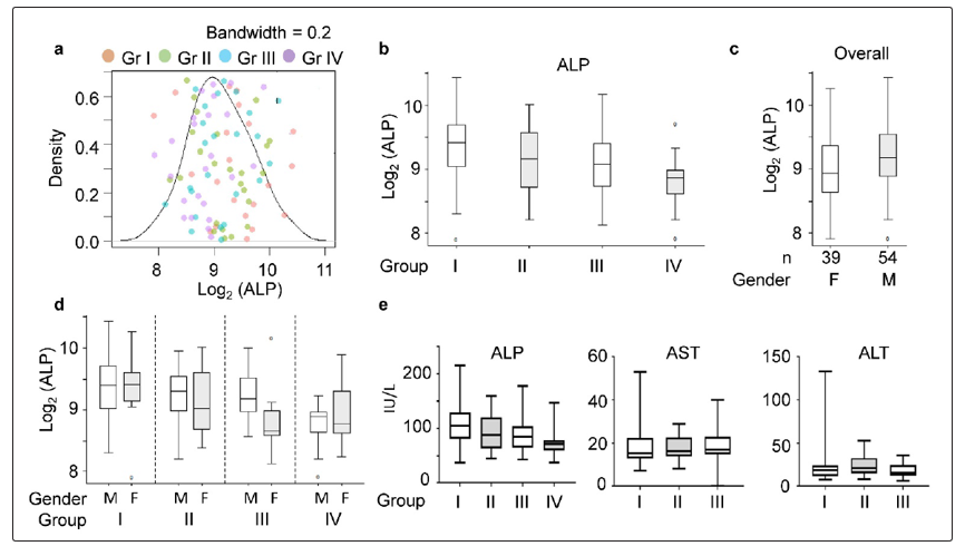 Table 1: (a) Age and gender distribution of study subjects in Groups 1 to 4. (b) The differential expression of Alkaline Phosphatase (ALP) within different study groups and statistical values. Probabilities of statistical significance (p-value) and log2 ALP values per group and gender. Probabilities of statistical significance between each group. (c) Probabilities of statistical significance between male and female between each group. (d) Descriptive statistical values of clinical ALP, Creatinine, and calculated eGFR for Groups 1 to 3.