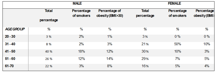 With regard to demographic and lifestyle characteristics, 14% of the participants with available BMI (body mass index) data had an index of more than (30 kg/m²), indicative of obesity. Regarding smoking habits , 15% of the sample were smokers, 3 % of which consume more than 20 cigarettes per day. This trend further declined with age: in the 25-40 age group, 88% of participants were non-smokers, the percentage dropped to 71% for the group of 41-60, and then raised up to 94% in those over 60 years of age.