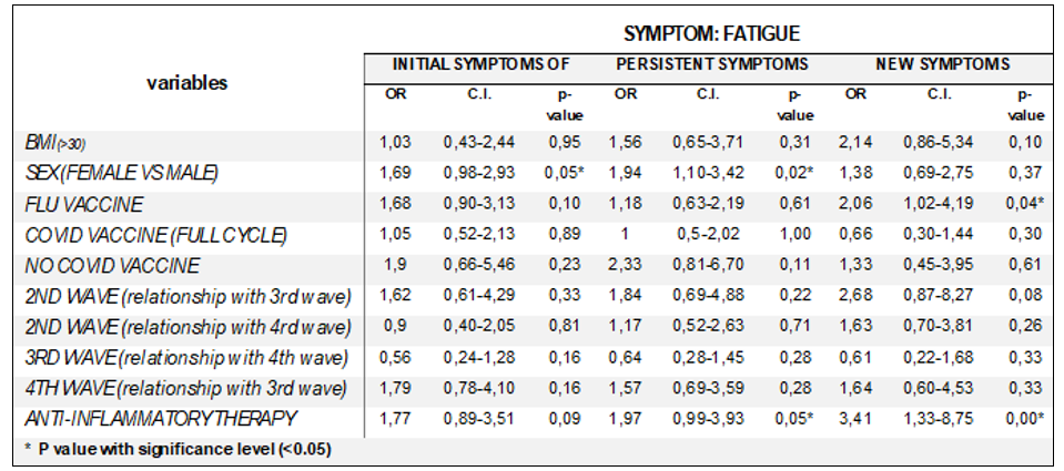 In general “Persistent symptoms" (OR 1.94, CI 1.10-3.42, p=0.02), suggest that women are significantly more likely to experience persistent fatigue; while for "new fatigue symptoms", there is no significant association between female gender and the occurrence of new fatigue episodes.
