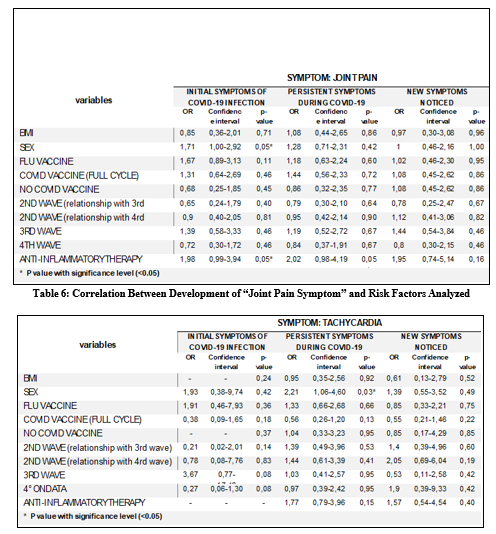 Symptoms of fatigue and tachycardia (Table 4,7) were associated with the female gender, both during infection and afterwards [21]. This finding, combined with the higher incidence of fatigue in those infected during the second wave (Alpha variant), suggests a different response between the virus variants, with the Alpha variant having a sensitive impact on long-term symptoms. This association is also significant for those who have used anti- inflammatory drugs, particularly for persistent and new symptoms. The importance of long-term patient monitoring appears crucial, especially in women, to manage the potential cardiovascular and systemic consequences of COVID-19.