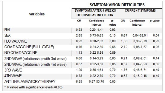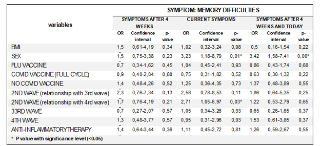 Neurological symptoms, including memory problems (Table 8), word-finding difficulties and slowed thinking, are more frequent in women and patients infected during the second wave [22]. This suggests a greater post-COVID cognitive impact for certain patient groups, outlining the need for careful monitoring and specific interventions to improve cognitive recovery, particularly for women and those infected with the Alpha variant. Data show an association between visual symptoms and the use of anti- inflammatory drugs, suggesting that such therapies may have an impact on these symptoms.
