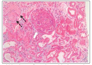 Figure 1: Renal histology of a patient with class IV lupus nephritis (white arrow shows a glomerulus with cellular crescent; black broken arrows show adjacent tubules with red cell casts)