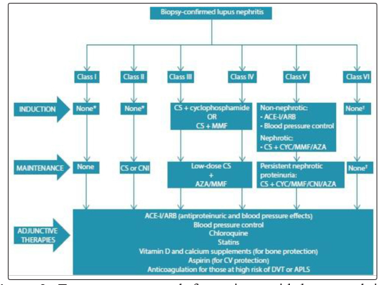 The treatment of LN is dictated by the class of the disease and degree of activity and chronicity indices. All patients should receive adjuvant therapies as indicated and if tolerated. There should be a risk-benefit evaluation when deciding whether to use immunosuppression in patients with increased chronicity indices (i.e. glomerular sclerosis with tubulo-interstitial fibrosis) because of the increased risk of side-effects of treatment. The approach to treatment often involves two phases for patients with proliferative LN (class III, class IV and mixed classV) [46, 47].