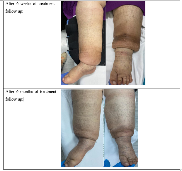 During the first session a full assessment of the patient was car-ried including setting long and short-term goals. Long term goals: were that the sitter to be independent with manual lymphatic drain¬age techniques, lymphedema prevention and risk factor reduction strategies, maintain reduction of limb girth achieved in phase 1 of treatment, maximize ROM and strength of lower extremities, to reach normal gait pattern, independence with postural correc¬tion in various positions, maximize independency with functional activities and to reduce her bilateral knee pain during movement and walking and tenderness over her skin in bilateral lower ex¬tremities. Long term goals to be met with first follow up visit in 6 months. As for the short-term goals: they were to reduce limb girth by 25-50%, to be independent with home exercise program, and independent with compression bandaging and skin care education