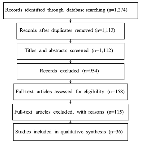 The systematic search yielded a total of 1,274 records, of which 981 remained after removing duplicates. Following title and abstract screening, 158 full-text articles were assessed for eligibility. Ultimately, 36 Systematic Reviews and Meta-Analyses (SRMAs) met the inclusion criteria and were included in this meta-review. Flowchart presents a PRISMA diagram summarizing the study selection process. In the summary Table, we provide a concise summary of the articles included in our study. Most of the articles scored above our 40% quality threshold, suggesting generally strong methodological standards based on our evaluation criteria. Only a few articles received average scores. Notably, more than 70% of the articles clearly reported their analytic time- frames, and all followed PRISMA guidelines. We grouped the articles into six thematic categories based on their main research focus.