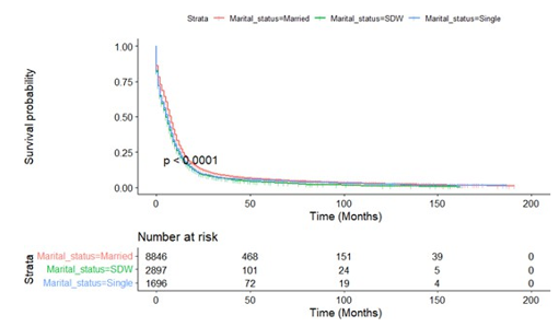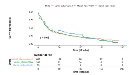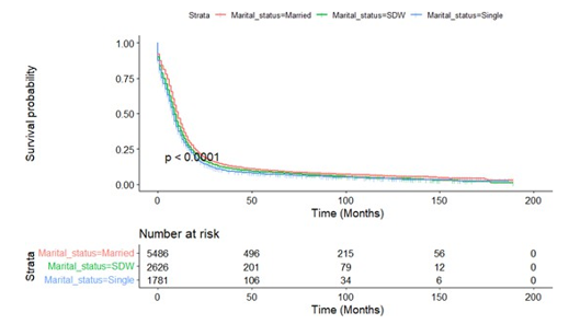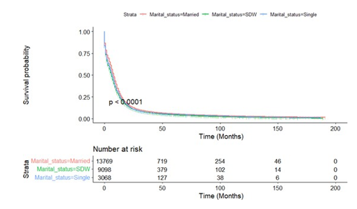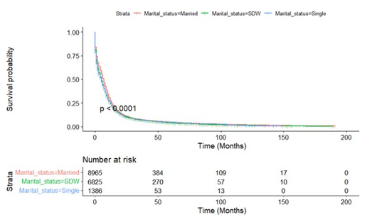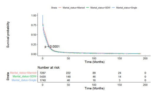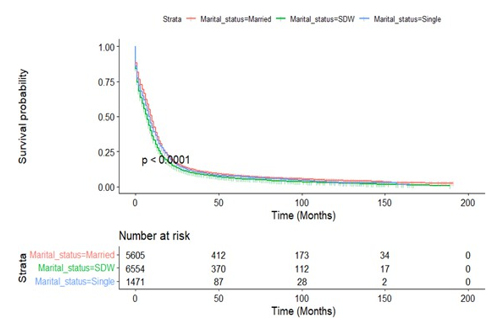The SEER database provides us the opportunity to perform large, population-based studies. However, there are several limitations in our study. An obvious limitation is that this is a retrospective study that has a greater probability of bias than prospective stud¬ies. In addition to demographic and clinical factors, there is a rel¬ative lack of control variables. For example, the database cannot provide important confounding variables such as smoking history, patient complications, and other treatment options. Secondly, the marital status recorded in the SEER database is only the marital status at the time of diagnosis. As for whether the patient’s subse¬quent marital status has changed, no follow-up visits and records have been performed, so the impact of this change on the study cannot be estimated. Thirdly, the SEER database does not incor¬porate data on the life quality of married patients, such as marital satisfaction or financial status.