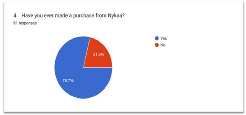 Interpretations- In the Chart we can Observe that 78.7% of People are aware about Nykaa and have made a Purchase.