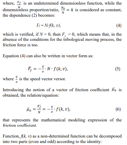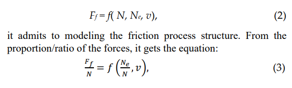 If we limit ourselves to these two elements, the process of actual bodies’ friction is greatly simplified. This statement may be counteracted by admitting that, independently of the physical properties of the friction pair, the power dissipation takes always place and accompanies the friction process, changing single coupler bodies by other ones, the dependence structure between N, Ne , ve, and Fe does not change, it is only the coefficients numerical value that change as the process may be considered to modify [2, 9-11].