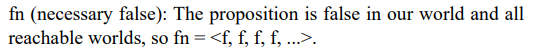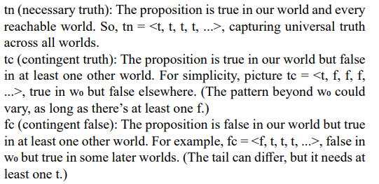 Imagine each truth value as an infinite sequence of binary values (t for true, f for false), indexed by worlds: w0 (our world), w1, w2, ..., w3, ..., where wn is the actual world and w1, w2, ... are worlds accessible from it in some ordered way. In these sequences, t and f are values understood in a classical bivalent logic manner, representing straightforward true or false assignments at each world.