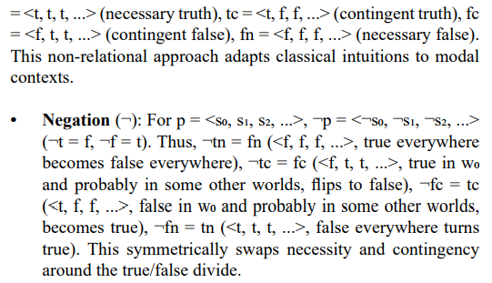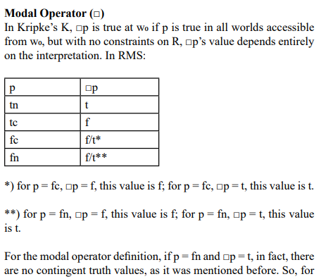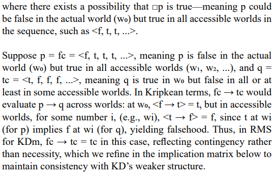 However, in some cases, a truth value approach like RMS can be more applicable and productive than a relational one. For instance, in decision theory, assigning truth values directly to propositions about outcomes (e.g., "this choice is necessarily beneficial" or "this outcome is contingently true") might simplify modeling without requiring an explicit relational structure. Similarly, in artificial intelligence, where systems often process propositions with graded or uncertain truth (e.g., "this sensor reading is likely true"), a truth value-based system can streamline computations over a relational framework. Since RMS works with truth values directly, Kripkean modal logics can potentially be generalized within RMS to incorporate infinite truth values, akin to fuzzy logic, where truth is a continuum rather than a binary or finite set.
