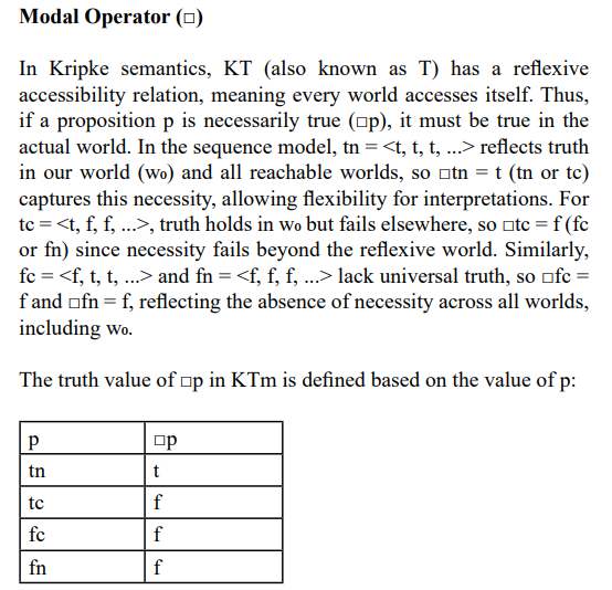 ’s values narrow, with S5m’s updated (tn, fn) matching KT4m’s (tn, f) in determinacy but sharpening f to fn, reflecting the equivalence relation’s total constraint. This evolution from Km’s vagueness to S5m’s precision captures a trade-off between generality and specificity, with RMS offering a truth-value lens that parallels Kripke’s relational approach, revealing their deep structural kinship.