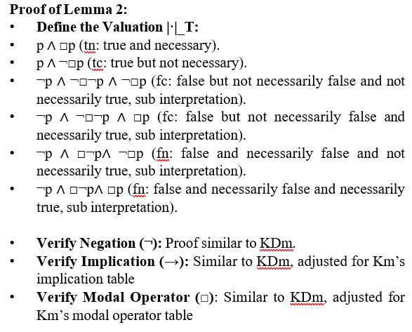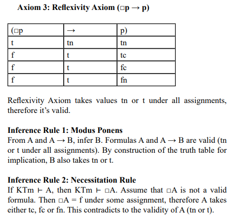 To establish this, we must show that each axiom of KTm is valid (i.e., takes only tn or t for all possible assignments of its propositional variables) and that the inference rules preserve validity.