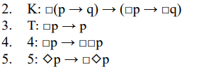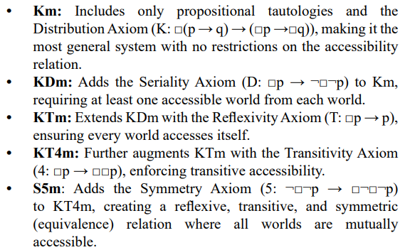 Thus, the set of axioms grows from Km to S5m (K ⊆ KD ⊆ KT ⊆ KT4 ⊆ S5), reflecting increasing constraints on the underlying Kripkean accessibility relation: none (Km), serial (KDm), reflexive (KTm), reflexive-transitive (KT4m), and reflexive-transitive- symmetric (S5m).