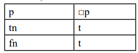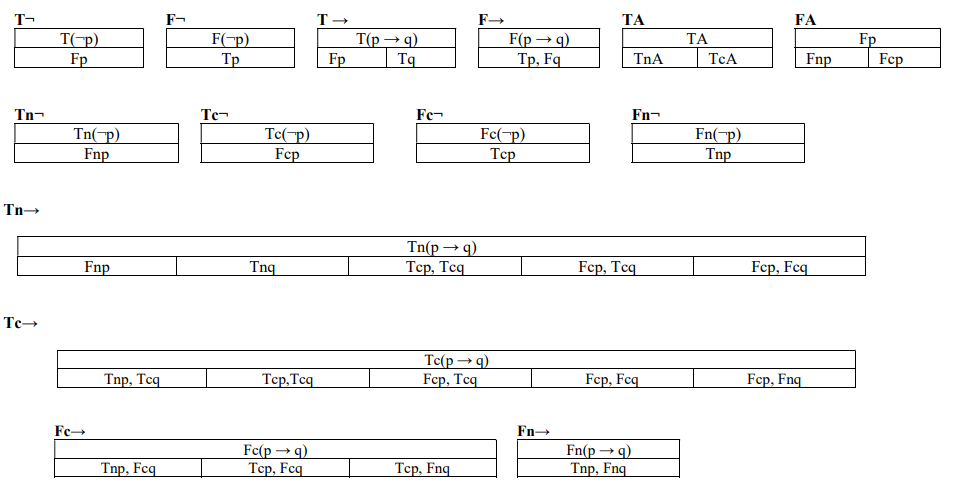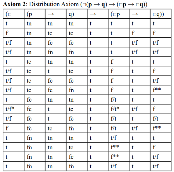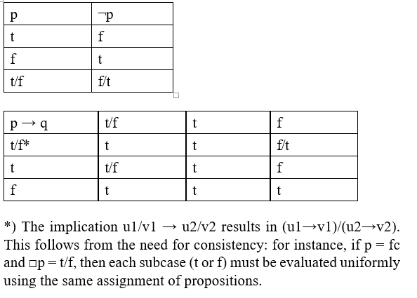 Here, "t" and "f" do not represent the values of classical two-valued logic; instead, they are indeterminate truth values. "t" stands for "either tn or tc," while "f" stands for "either fc or fn."