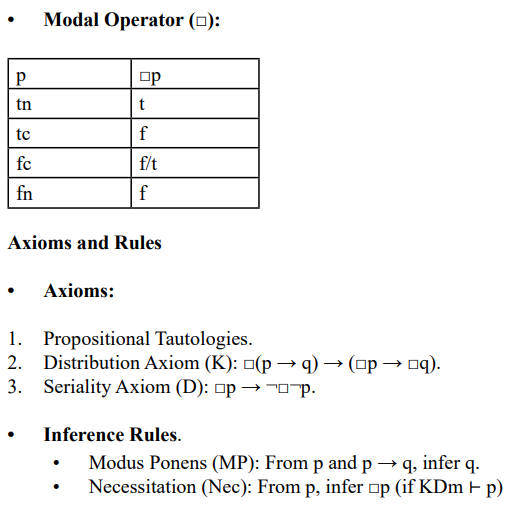 In deontic logic, the modal operator O (obligation) can be interpreted in RMS as follows: a proposition Op takes tn if p is obligatory in all contexts (e.g., a universal duty), tc if p is obligatory in the current context but not universally (e.g., a situational duty), fc if p is not obligatory but permissible in some contexts, and fn if p is forbidden (never obligatory). The indeterminate value t (tn or tc) can represent cases where p’s obligation status is contextually ambiguous—obligatory in some sense but not precisely determinate—while f (fc or fn) indicates a lack of obligation, possibly ranging from permissible to prohibited. This setup allows RMS to capture nuances like deontic dilemmas (e.g., Op ∧ O¬p) by exploring cases where conflicting obligations might resolve differently.